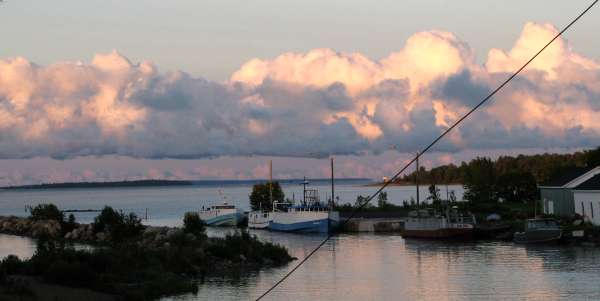 We stopped for the night, three nights in fact, at Blind River, so named for its harbor mouth being blind to the passing ships. There we enjoyed the history--a major lumbering port in the late Nineteenth and early Twentieth Centuries, the natural beauty, and a room overlooking the small commercial fishing harbor off the North Channel and Lake Huron. Today it's a small village with remnants of lumbering, a uranium refinery, and tourism. We even met two Naperville lawyers on our hike on the Voyageur Trail, a trail being built across Ontario, and part of the Trans Canada Trail, not unlike our Appalachian and Pacific Crest trails.