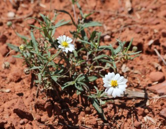 As usual, it was warm and sunny, in the high 80s F (30+ C). But the old jeep trail wended its way through a wide, open canyon whose sides were covered with low vegetation such as Mesquite, Prickly Pear Cacti, grasses, and occastional pines and junipers. Mesquite and its small leaves told of water nearby, as did the increase in wildflowers, birds, and other wildlife, but I never saw it. A scruffy horse, perhaps a wild horse, darted fearfully across the trail, and a Black-tailed Jack Rabbit hiding next to a yucca raced away. The mystery, though, was the dramatic change in soil. The first mile was red, typical of the area. Then came a dry creek (arroyo) filled with cobble and boulders across the trail. Immediately after crossing it, the soil became light brown or pale gray. Geologic processes from millions of years ago were the likely cause. But what were they? Guess I have more digging to do, again. Back to "Roadside Geology of Arizona."